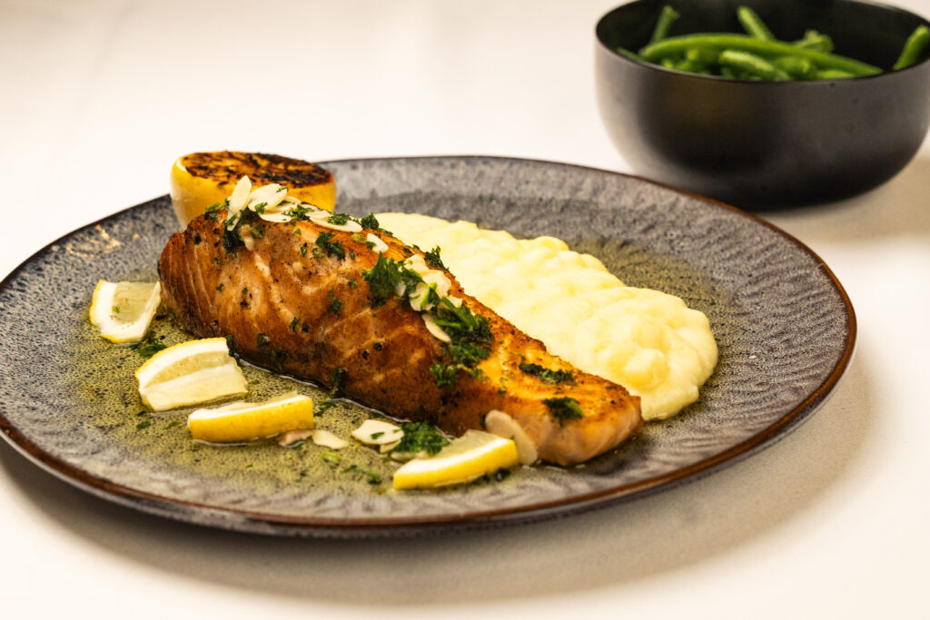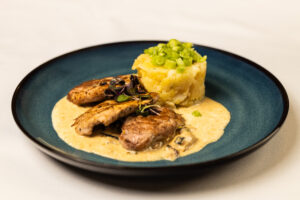 Menu V: 150 kurací steak na hokkaido pyré s restovaným ružičkovým kelom (7) 8,50 €