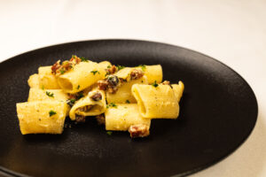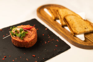Menu II: 150/100/200 bravčové karé plnené sušenými slivkami,slivková omáčka,pečené zemiaky s tymiánom 8,50 €